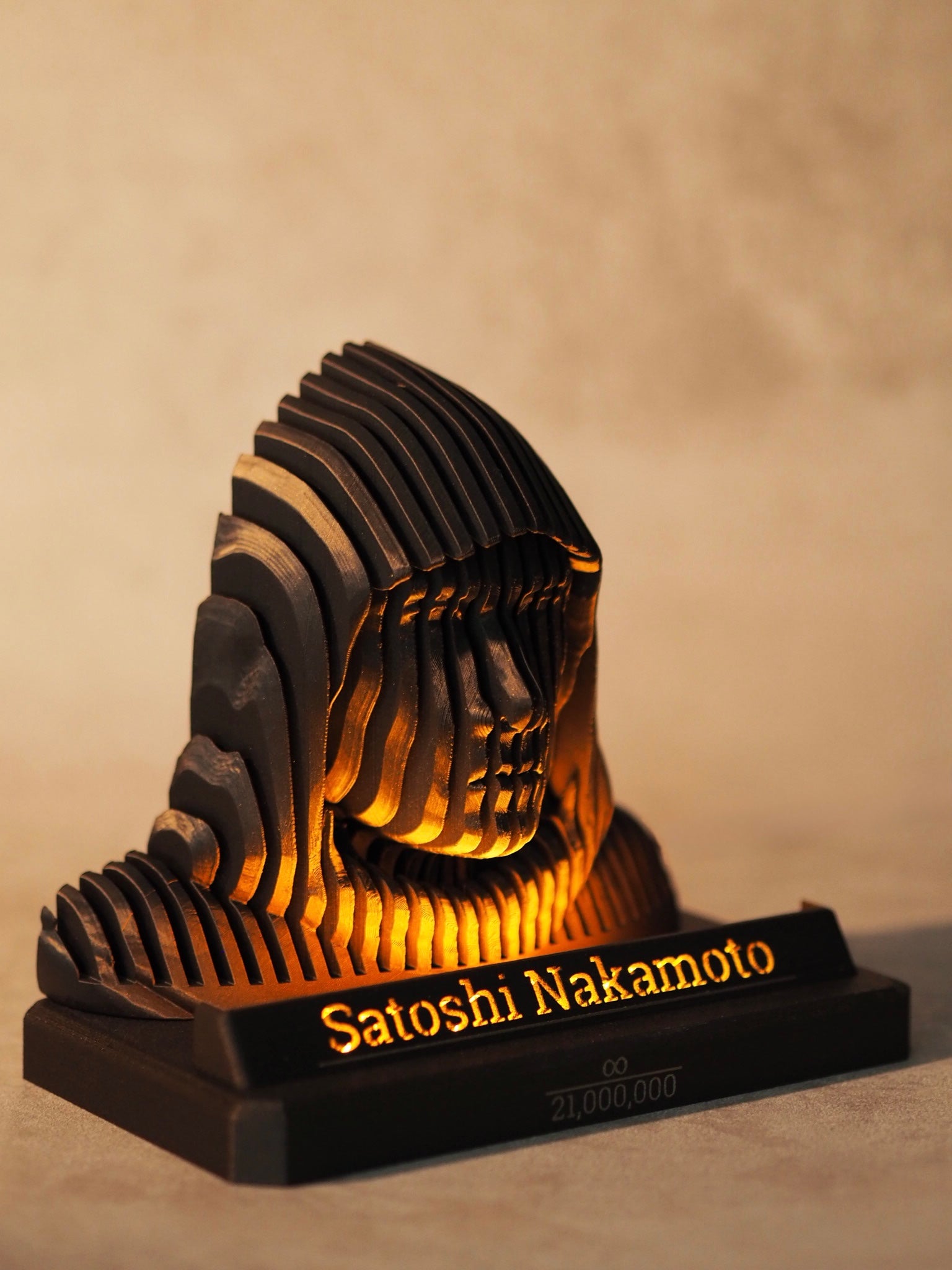 Hochwertige, indirekt beleuchtete Darstellung von Satoshi Nakamoto. Inspiriert durch die Lugano Satoshi Statue !