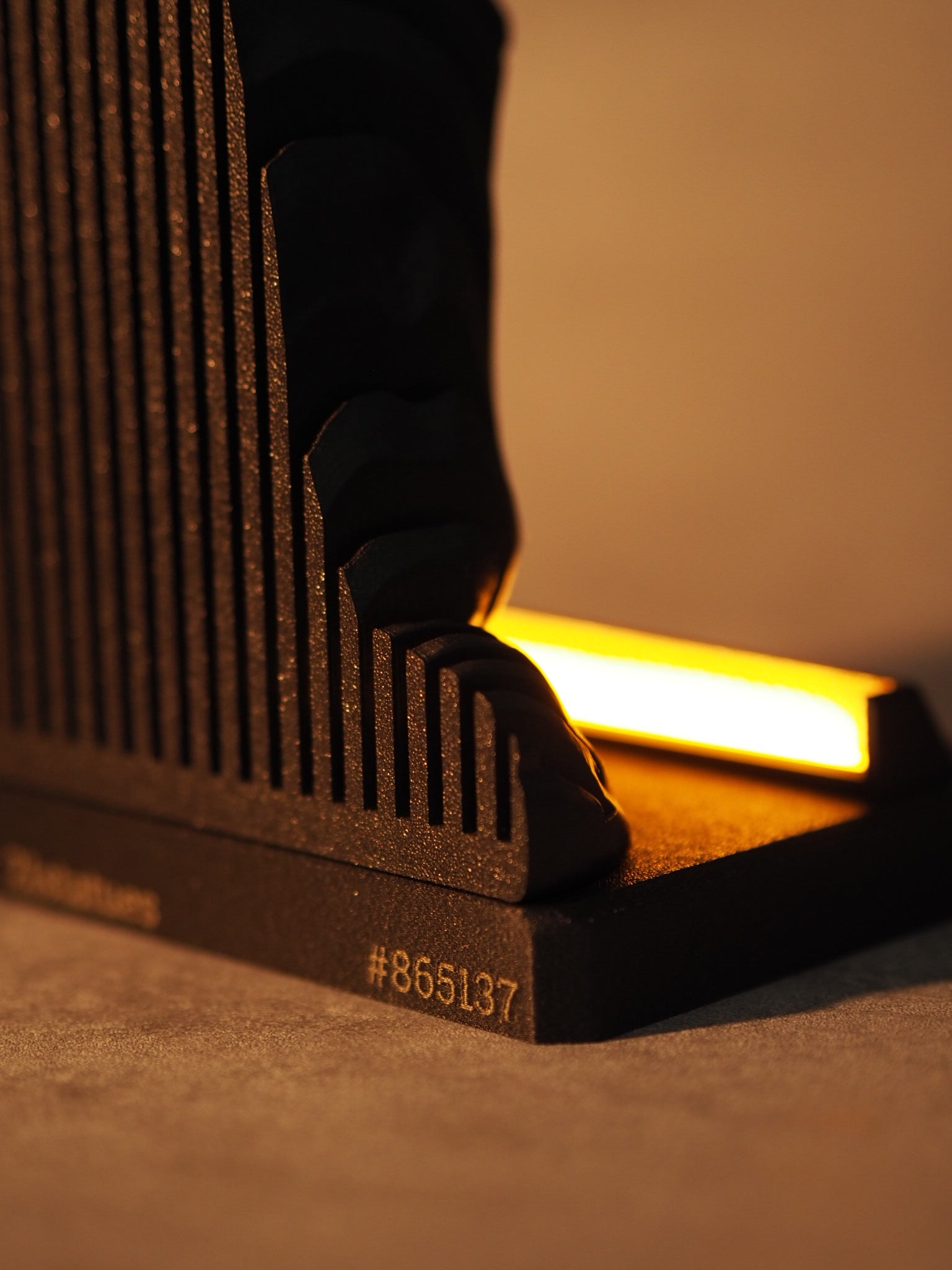 Im Design der Statue ist ein präziser Kartenschlitz eingearbeitet – dezent platziert zwischen dem Unendlichkeitssymbol und der Zahl 21.000.000, wo die Karte perfekt hineinpasst und zum Teil des Kunstwerks wird.
